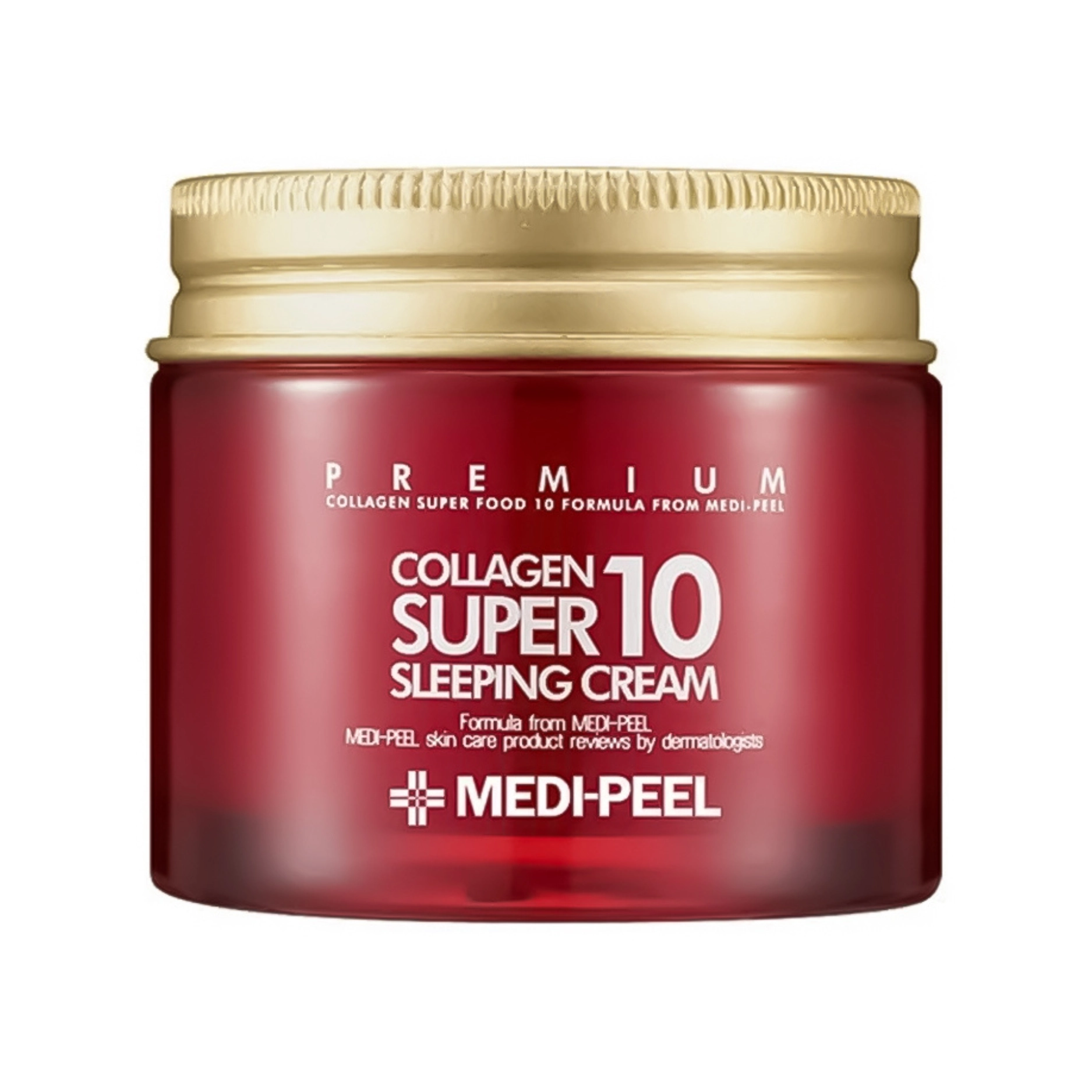 Medi-Peel Collagen Super10 Sleeping Cream – омолоджувальний нічний крем для обличчя з високою концентрацією колагену, що інтенсивно відновлює еластичність шкіри, підвищує її пружність та формується овал обличчя. Крем містить 10,000 ppm колагену, що стимулює вироблення еластину та колагену, а також комплекс з екстрактів 10 суперфудів для глибокого зволоження та живлення. Крем відновлює гідроліпідний бар'єр шкіри, зменшує глибину зморшок та бореться зі старінням епідермісу.