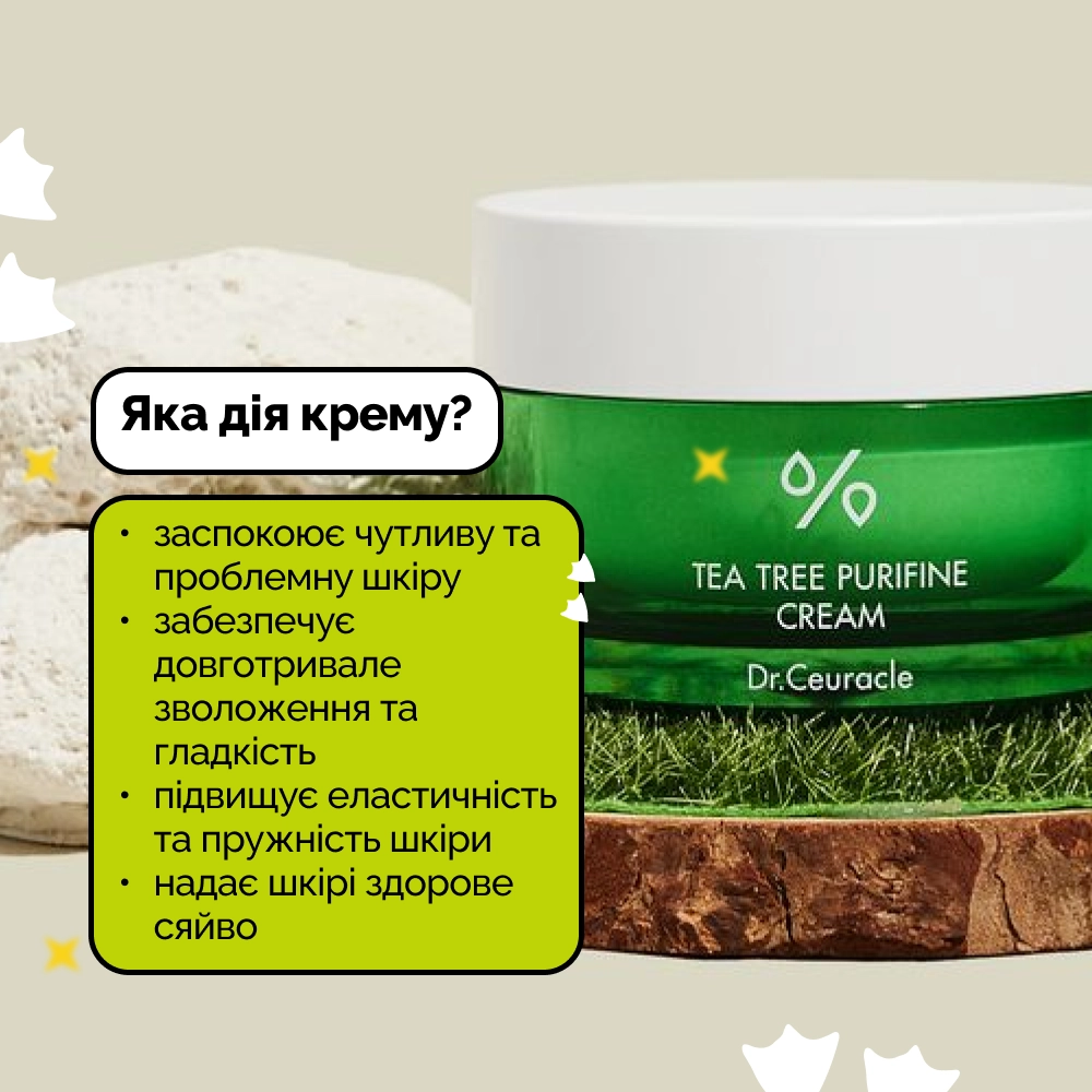На заключному етапі Вашого догляду за шкірою рівномірно розподіліть невелику кількість крему по обличчю та шиї, легко поплескайте для кращого вбирання. Для досягнення кращого результату рекомендується використовувати крем двічі на день (зранку та ввечері) в комплексі з іншими засобами Dr. Ceuracle з екстрактом чайного дерева.