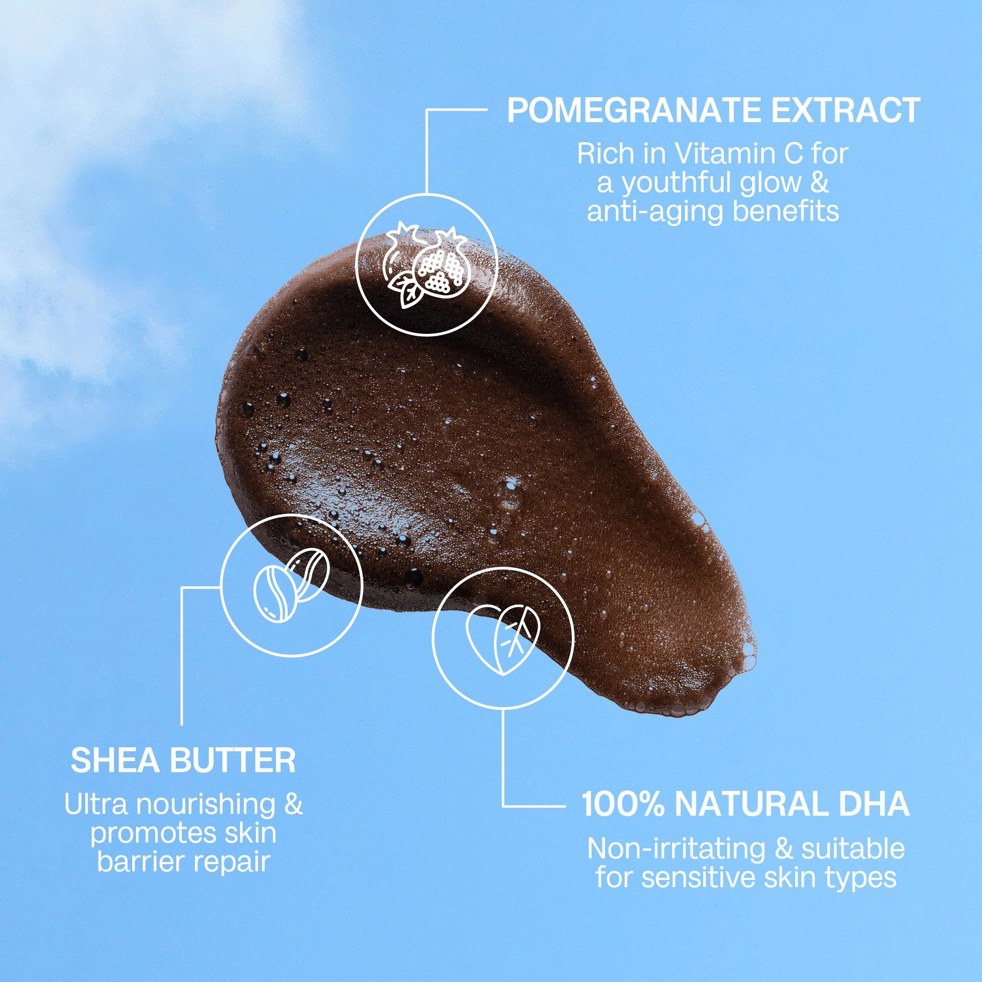 Склад: Water (Aqua), Propylene Glycol, Dihydroxyacetone, Glycerin, Erythrulose, Ethoxydiglycol, Dimethyl Isosorbide, PEG-40 Hydrogenated Castor Oil, Caprylyl/Capryl Glucoside, Cocamidopropyl Betaine, Sodium Lauroamphoacetate, Sodium Metabisulfite, Cetyl Hydroxyethylcellulose, Hexyl Cinnamal, Coffea Arabica (Coffee) Seed Extract, Hydrated Silica, Disodium Phosphate, Silica Dimethyl Silylate, Sodium Phosphate, Punica Granatum Fruit Extract, Chamomilla Recutita (Chamomile) Flower Extract, Butyrospermum Parkii (Shea) Butter, Alcohol, Fragrance (Parfum), Xanthan Gum, Citric Acid, Sodium Citrate, Phenoxyethanol, Benzyl Alcohol, Ethylhexylglycerin, Potassium Sorbate, Sodium Benzoate, Limonene, Linalool, Citronellol, Geraniol, Alpha-Isomethyl Ionone, Red 40 (CI 16035), Yellow 5 (CI 19140), Blue 1 (CI42090).
