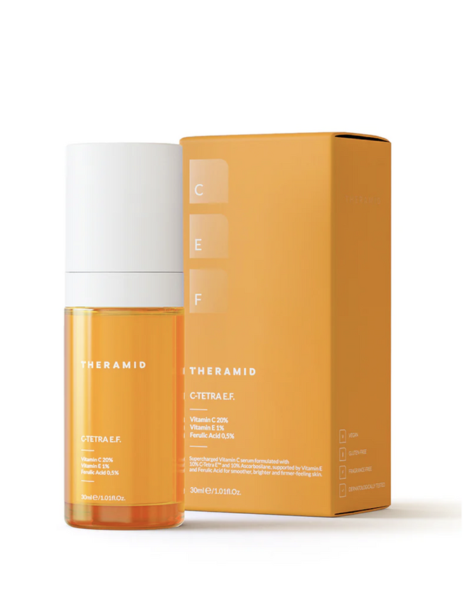 Це лікування високими дозами вітаміну С із сильним антиоксидантним ефектом було розроблено, щоб забезпечити оптимальний захист від вільних радикалів, сприяти сяйву шкіри та протидіяти фотостарінню - для помітно більш сяючої, гладкої, пружної та молодшої шкіри. У цій формулі ми використовуємо три різні види вітаміну С. Чому? Дуже просто: функція вітаміну С різна в різних шарах шкіри, і щоб отримати максимальну користь від вітаміну С, необхідно поєднувати різні види вітаміну С. У продуктах по догляду за шкірою використовується багато різних типів вітаміну С, і ми вибрали найстабільніші та найчистіші, щоб забезпечити ефективність цієї формули на всіх шарах шкіри. Нижче ми пояснюємо відмінності: C-TETRA EF складається з 10% вітаміну C Tetra, який є високобіологічно сумісним і жиророзчинним. Завдяки своїй жиророзчинності цей тип вітаміну С може транспортуватися до найглибших шарів шкіри. Там його дія зосереджена на меланоцитах (для лікування плям зсередини) і на синтезі колагену для запобігання та боротьби з зморшками зсередини. Формула доповнена аскорбосиланом і аскорбілглюкозидом, двома іншими дуже стабільними і водорозчинними похідними вітаміну С. Вони впливають на поверхню шкіри, освітлюючи колір обличчя та зменшуючи поверхневі плями. Формула доповнена вітаміном Е та феруловою кислотою, відзначеною нагородами комбінацією, яка посилює антиоксидантну дію сироватки та захищає шкіру протягом дня.